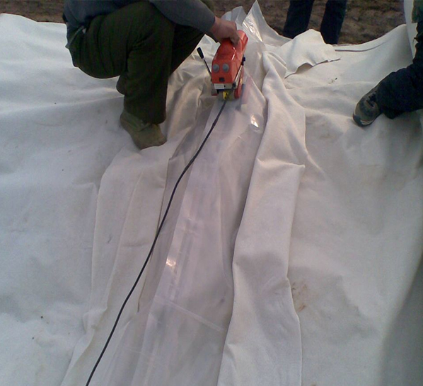 復(fù)合土工膜的接縫處理是一個(gè)關(guān)鍵工序,直接影響防滲效果。一般接縫方式有:①搭接:搭接寬度宜大于15cm;②熱焊:宜于稍厚的土工膜基材,焊縫搭接寬度不小于5CM.(不推薦膠接,長時(shí)間水浸泡易開膠,防滲效果差.)