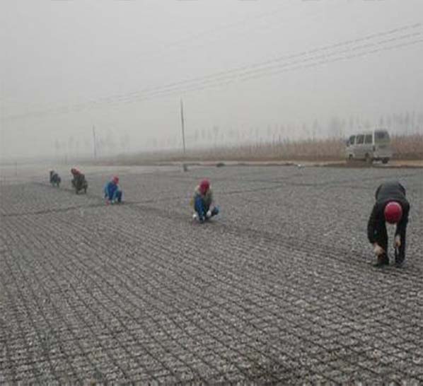 3、接鋪:以卷長(zhǎng)為單位作為鋪設(shè)的段長(zhǎng),應(yīng)鋪格柵的段長(zhǎng)內(nèi)鋪滿以后,再整體檢查一次鋪設(shè)質(zhì)量,然后接著鋪設(shè)下一段,下一段鋪設(shè)時(shí),格柵與格柵以重疊一個(gè)網(wǎng)格凈距為搭接長(zhǎng)度,并用綁線固定后繼續(xù)向前進(jìn)方向鋪第二段。依次類推,操作要求同前。