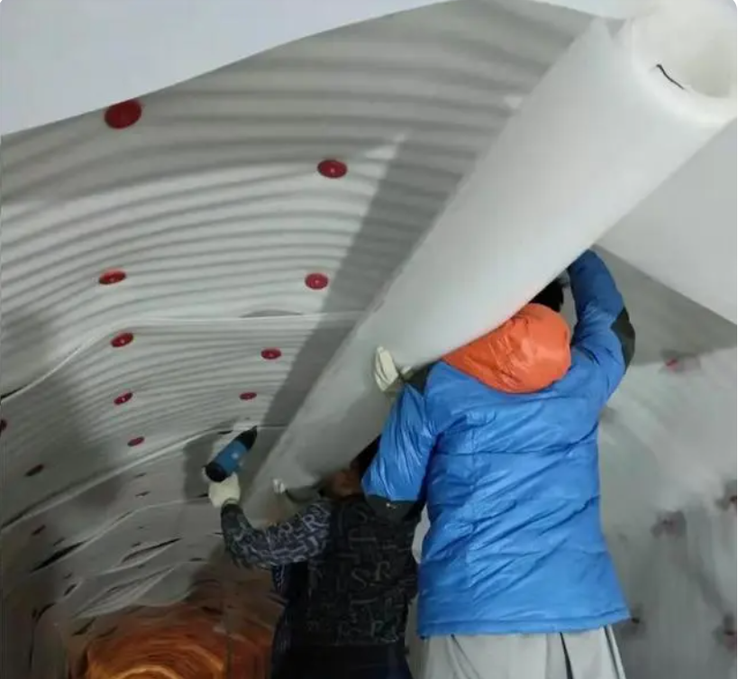 隧道EVA吊掛式防水板的安裝方法是:先在基礎表面涂刷專用膠水,然后將防水板吊掛在基礎表面上,并用專用膠水將各板材粘接在一起,最后用專業(yè)工具在板材連接處進行密封處理。該防水板施工完畢后,可在其表面覆蓋一層防護層,以保護其不受外力破壞和污染。